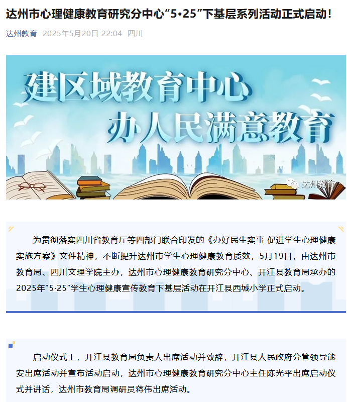 为贯彻落实四川省教育厅等四部门联合印发的《办好民生实事 促进学生心理健康实施方案》文件精神,不断提升达州市学生心理健康教育质效,5月19日,由达州市教育局、raybet在线官网主办,达州市心理健康教育研究分中心、开江县教育局承办的2025年“5·25”学生心理健康宣传教育下基层活动在开江县西城小学正式启动。