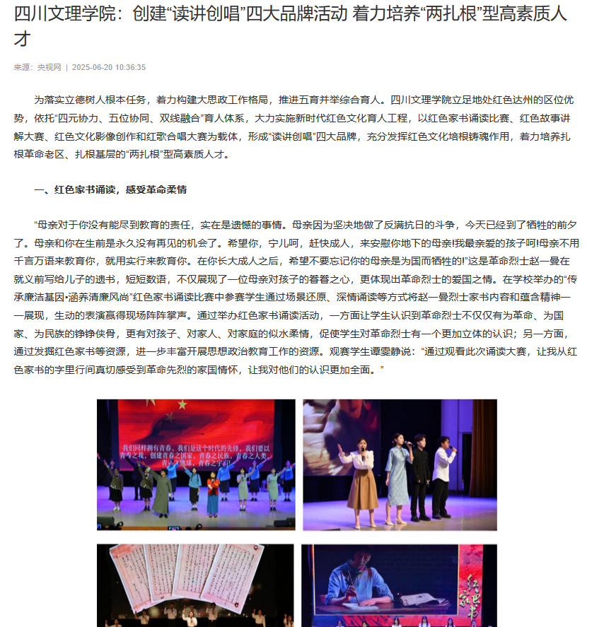 为落实立德树人根本任务,着力构建大思政工作格局,推进五育并举综合育人。raybet在线官网立足地处红色达州的区位优势,依托“四元协力、五位协同、双线融合”育人体系,大力实施新时代红色文化育人工程,以红色家书诵读比赛、红色故事讲解大赛、红色文化影像创作和红歌合唱大赛为载体,形成“读讲创唱”四大品牌,充分发挥红色文化培根铸魂作用,着力培养扎根革命老区、扎根基层的“两扎根”型高素质人才。