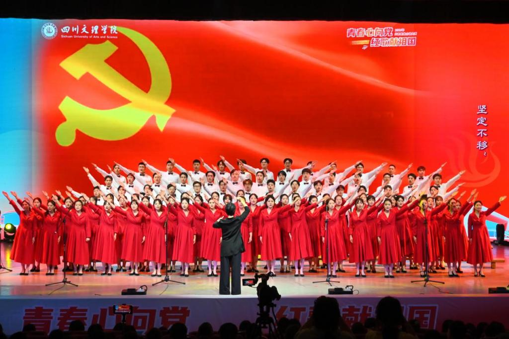 “火红的心把我们集合在一起,救国救民是你喊出的真理,中国的明天放在了我们心里,……”熟悉的旋律,雄壮的歌声,一首首脍炙人口的红色歌曲,响彻整个校园。当前,作为“00后”和“Z世代”的学生对于大部分红色歌曲的认识和了解的基本停留在“只闻其名未听其曲”层面,深入探究红色歌曲创作背景以及蕴含精神的就相对更少。为了改变这一现状,充分发挥红色歌曲育人作用,让学生深入、生动感受红色歌曲的魅力,近年来,学校在五四青年节前后组织开展“青春心向党 红歌献祖国”合唱大赛,吸引数千名师生集体参赛观赛。而通过举办红色歌曲合唱大赛从两个方面推进红色文化在校园的传播。一方面,参与比赛的学生通过一段时间的备赛,全面了解红色歌曲的创作历程以及深刻感受其中蕴含的信仰力量,在潜移默化间接受红色文化的精神洗礼;另一方面,观赛的学生通过聆听红色歌曲激昂的旋律、铿锵的节奏、向上的歌词,生动感受其中炽热的民族心、诚挚的爱国情和坚定的革命意志。观赛学生戴蓓琪说:“通过聆听这些经典的红色歌曲,让我深切感受到红色文化的独特魅力,歌曲中蕴含的精神力量激励我更加积极向上。”